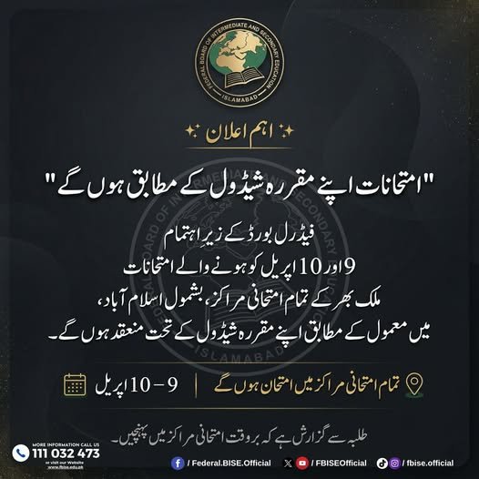 Islamabad: The Federal Board of Intermediate and Secondary Education (FBISE) has issued an important announcement confirming that upcoming examinations will be conducted as per the scheduled plan.