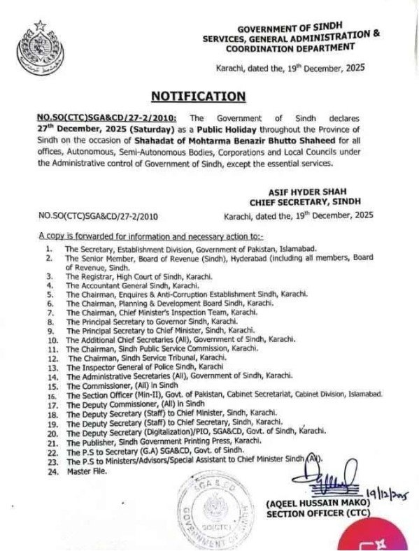 According to the released notification by the Services, General Administration and Coordination Department, all educational institutes, public and private offices, and every organisation under the control of the Sindh administration would remain closed on December 27.