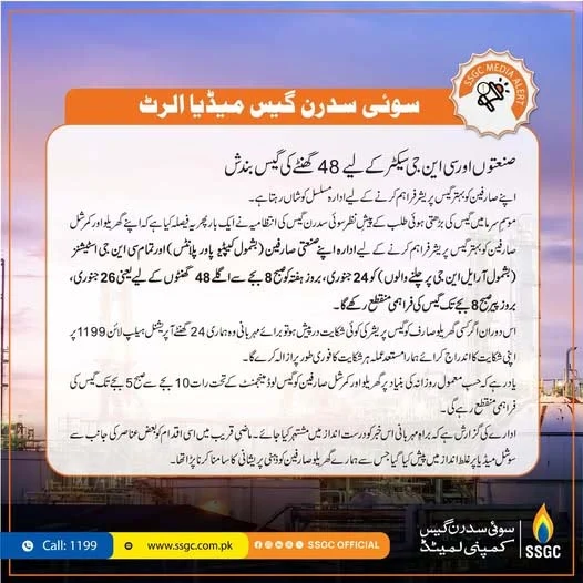 Web Desk: Sui Southern Gas Company will suspend gas supply to industries and the compressed natural gas sector for 48 hours starting Jan. 24, as authorities move to manage rising winter demand and improve pressure for household consumers.