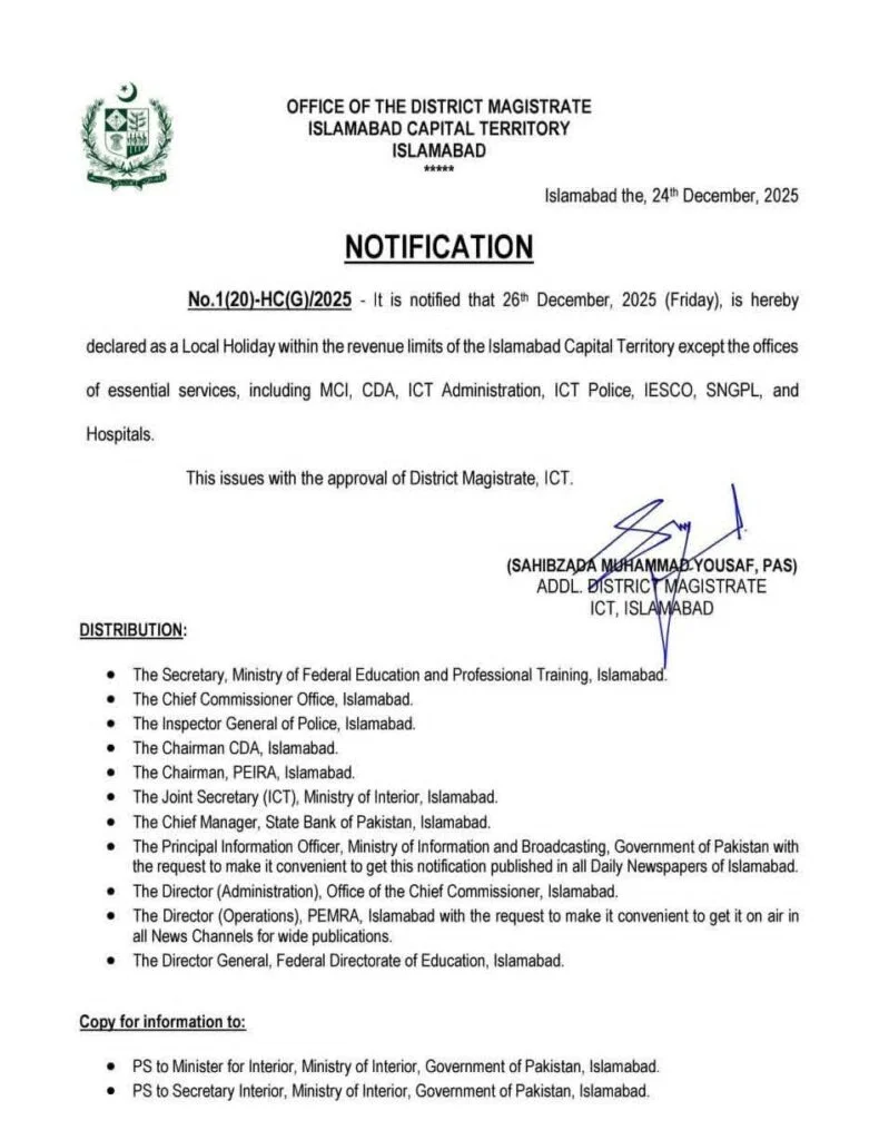 The declaration effectively provides Islamabad residents with a longer break from Dec. 25 to Dec. 28, combining the local holiday with scheduled public holidays.