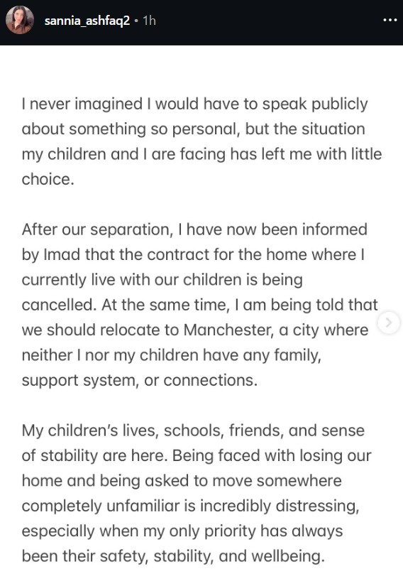 She said the problems began after the separation. According to her statement Imad Wasim informed her that the contract for the house where she lives with the children will be cancelled.