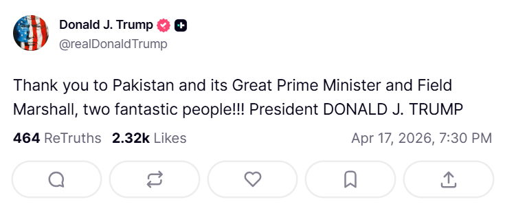 Although Iran did not specify how long the ceasefire would last, Trump also issued a statement expressing broader diplomatic appreciation, saying: “Thank you to Pakistan and its great Prime Minister and Field Marshal, two fantastic people