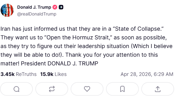 Iran has just communicated us that they are in a ‘State of Collapse.’ They want US to ‘Open the Hormuz Strait,’ instantly, as they try to ‌figure ⁠out their leadership situation (Which I believe they will be able to do!)” Trump said in a social media post.