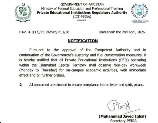 According to the notification, all Private Educational Institutions (PEIs) within the Islamabad Capital Territory must now observe on-campus academic activities from Monday to Thursday. Consequently, students and staff will receive three weekly holidays, including Friday, Saturday, and Sunday. This new schedule takes effect immediately and will remain in place until further orders.