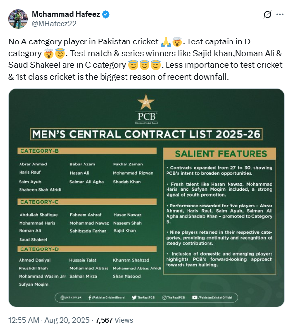 Former captain Mohammad Hafeez amplified criticism, posting on X: “No A category player in Pakistan cricket. Test captain in D category. Test match & series winners like Sajid Khan, Noman Ali & Saud Shakeel are in C category… Less importance to Test cricket & 1st class cricket is the biggest reason of recent downfall.”
