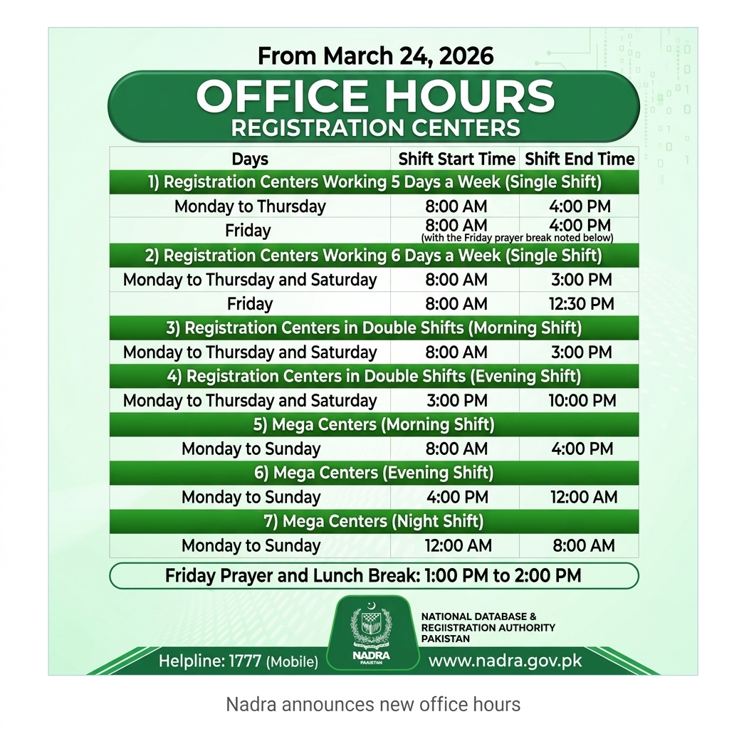 The authority also notified a mandatory break for Friday prayers at all centers, which will take place from 1:00 PM to 2:00 PM. Citizens are encouraged to visit their nearest centers according to these new slots or contact the NADRA helpline at 1777 for further guidance.