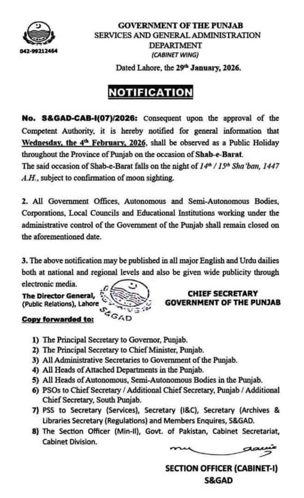 Punjab govt declares public holiday on the occasion of Shab-e-Barat across the province on Wednesday, February 4, and a formal notification has been issued in this regard.