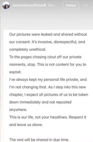 Khan used her social media platform to validate the news. She criticized the unauthorized distribution of her personal moments. While entering a new life chapter, she described the news leak as unethical. Khan stated that people shared the pictures without consent. She urged social media pages to stop circulating the images and asserted that her private life is not public content.