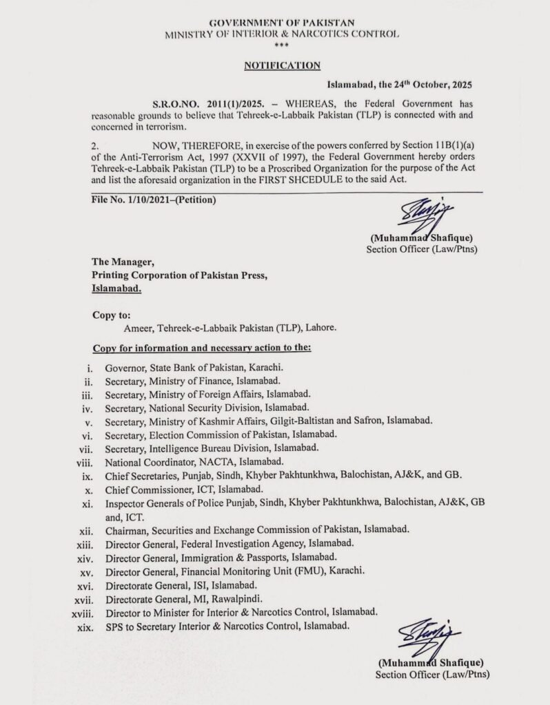 The move marks one of the most significant crackdowns in recent years against TLP, which has staged multiple nationwide protests disrupting transport, damaging property, and clashing with law enforcement agencies.