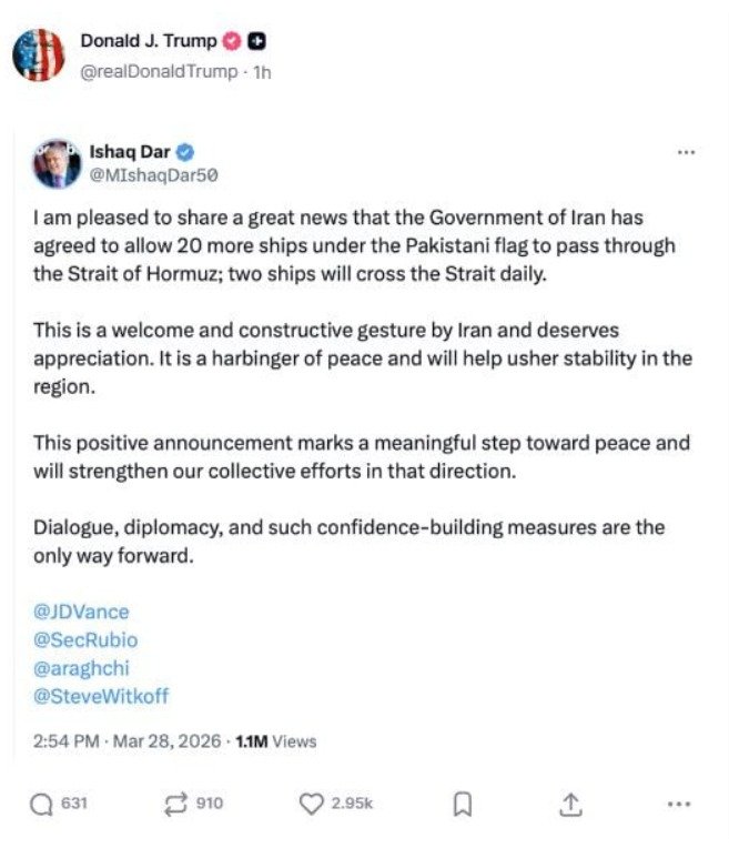 President Trump’s decision to share Dar’s post has sparked global interest. Consequently, experts believe this confirms Pakistan’s role as a key mediator. Currently, Islamabad is relaying a 15-point U.S. peace proposal to Tehran. This effort aims to lower oil prices, which recently climbed above $100 per barrel.